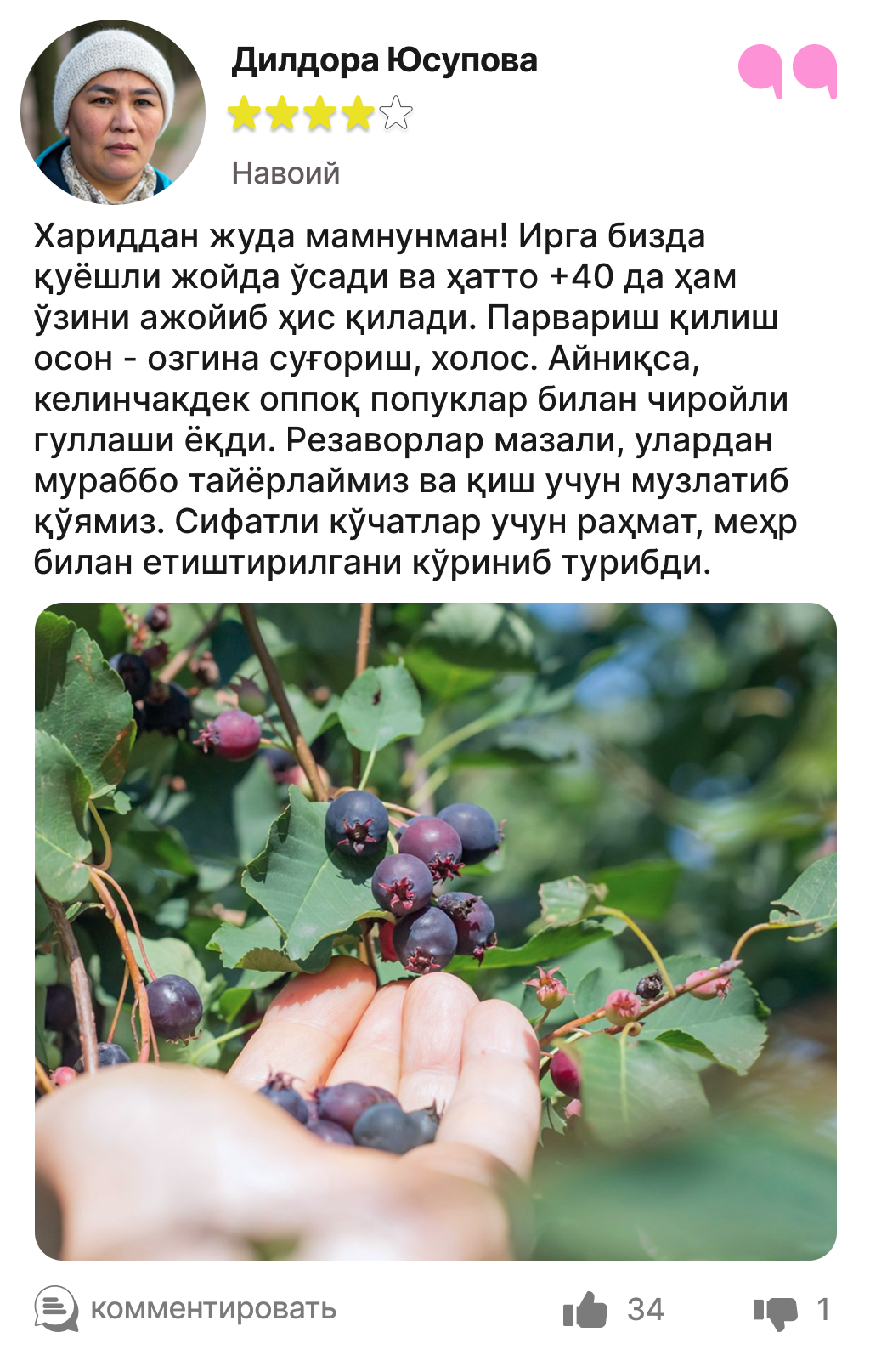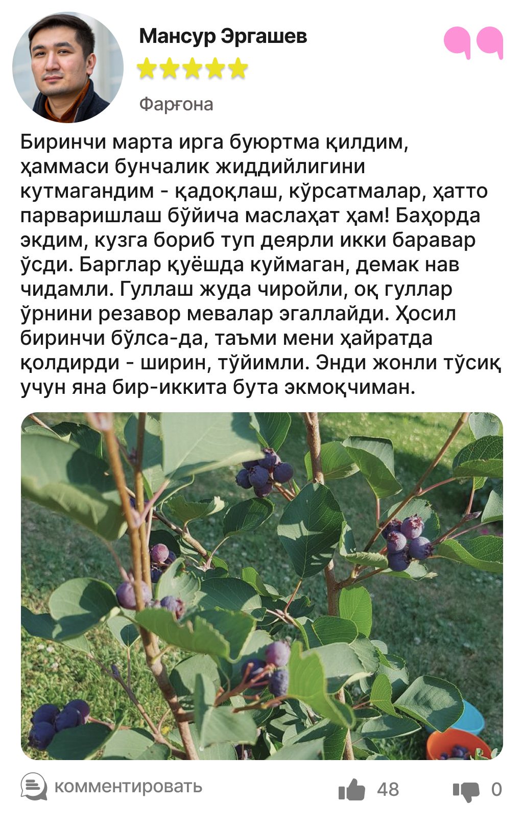 Харидорларимиз сотиб олинган ва етиштирилган ирга кўчатлари ҳақидаги таассуротлари билан ўртоқлашмоқда.